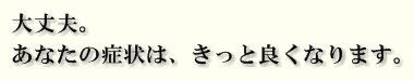 このような考えで、症状の程度に関係なく、真摯に治そうとしている方であれば、当院は間違いなくあなたの力になれるでしょう。